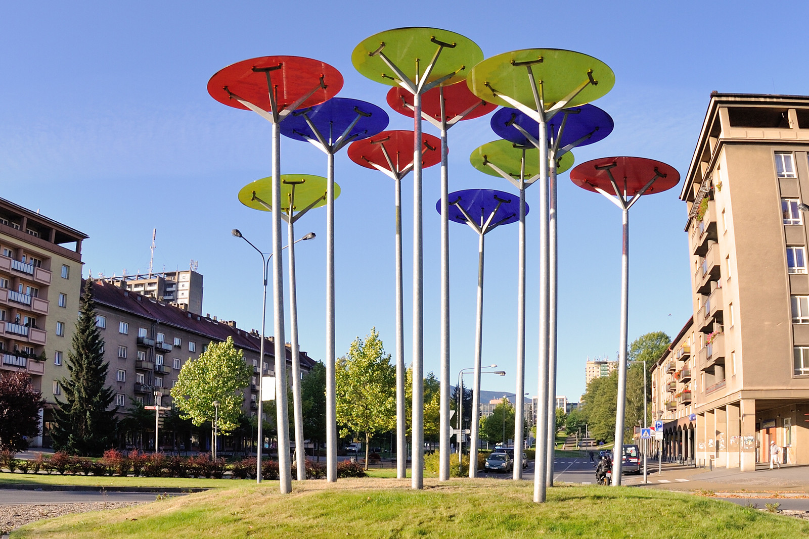Kovové „stvoly“ mají tvar mírně prohnutých, rytmicky rozmístěných trubic, které se rozvíjejí směrem vzhůru, jako by vyrůstaly ze společného základu. Každý květ se odlišuje barvou a proporcí, čímž autor dosahuje efektu pohybu, rozmanitosti a světelné hry. Tvrzené sklo navíc reaguje na denní světlo – ve slunečním svitu se leskne a mění barevné odstíny podle úhlu dopadu paprsků.